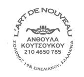 COOKIES H L' Art de Nouveau μπορεί να χρησιμοποιεί cookies για την αναγνώριση του χρήστη. Τα cookies είναι μικρά αρχεία κειμένου που αποθηκεύονται στο σκληρό δίσκο κάθε χρήστη, δεν λαμβάνουν γνώση οποιουδήποτε εγγράφου ή αρχείου από τον υπολογιστή του και χρησιμοποιούνται μόνο για τη διευκόλυνση πρόσβασης του χρήστη σε συγκεκριμένες υπηρεσίες και για στατιστικούς λόγους, προκειμένου να καθορίζονται οι περιοχές στις οποίες οι υπηρεσίες του anthoulakoutsoukou.gr είναι χρήσιμες ή δημοφιλείς ή για λόγους marketing. O χρήστης μπορεί να ρυθμίσει το διακομιστή του, ώστε να μην λαμβάνει cookies, είτε συνολικά, είτε κατά περίπτωση. Σε τέτοια περίπτωση ο χρήστης δεν μπορεί να έχει περαιτέρω πρόσβαση στις υπηρεσίες αυτές.